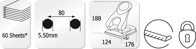 Zware kantoorperforator voor maximaal 60 velllen. Met een metalen aanleg. Handige bovendeel-vergrendeling voor ruimtebesparend opbergen. Metalen apparaat. Verwijderbare opvangbak. Passend bij nietmachines ‘Trendy’.