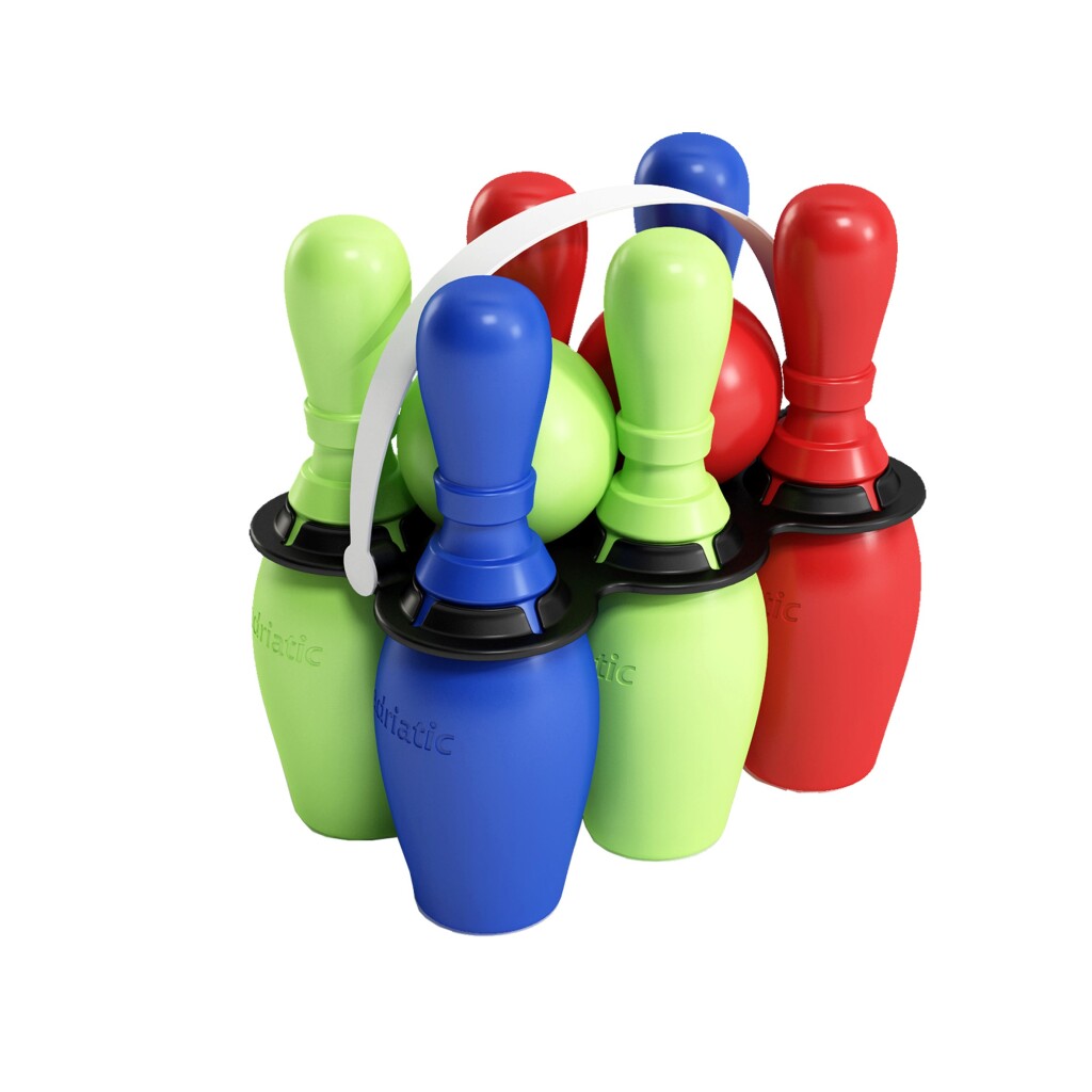 Kegelset, probeer zoveel mogelijk kegels in één keer om te gooien met de bal. Het spel is geschikt om zowel binnen als buiten te gebruiken