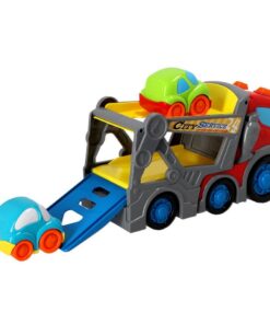 31 cm grote KiddyGo transporter van stevig kunststof, met 2 kleine auto’s als extraatje. De transporter heeft stoere licht- en geluidseffecten waar kinderen door geboeid zullen zijn. Ontwikkelt de motoriek, zintuigen en creativiteit van jonge kinderen. Geschikt voor kinderen vanaf 18 maanden.