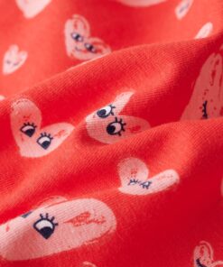Deze kinderjumpsuit heeft korte mouwen, een ronde halslijn, een trekkoord in de taille en 2 voorzakken en hij sluit met een reeks drukknopen. Op dit kinderpakje staan allemaal cartoonhartjes afgebeeld. Het kinderpakje is gemaakt van zacht materiaal met 95% katoen en 5% elastaan, waardoor het comfortabel en ademend is.