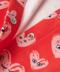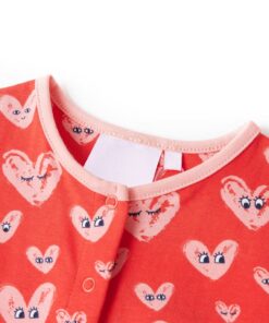 Deze kinderjumpsuit heeft korte mouwen, een ronde halslijn, een trekkoord in de taille en 2 voorzakken en hij sluit met een reeks drukknopen. Op dit kinderpakje staan allemaal cartoonhartjes afgebeeld. Het kinderpakje is gemaakt van zacht materiaal met 95% katoen en 5% elastaan, waardoor het comfortabel en ademend is.