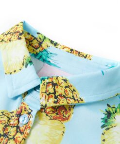 Deze kinderjurk heeft korte mouwen en een omgeslagen kraag en hij sluit met een rij knopen. Deze kinderjurk is met ananassen bedrukt. Het korte kinderjurkje is gemaakt van zacht materiaal met 50% polyester, 40% viscose en 10% katoen, waardoor het comfortabel en ademend is.