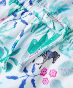 Dit kinderjurkje heeft een ronde halslijn, kapmouwen en een elastische tailleband met trekkoord en het sluit met een knoopje in de nek. Op deze kinderjurk zijn zebra’s, bloemen en bladeren afgebeeld. Het korte kinderjurkje is gemaakt van zacht materiaal met 94% katoen en 6% elastaan voor comfort en ademend vermogen.