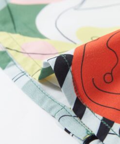 Deze kinderjurk heeft korte mouwen met ingenaaide omslagen en een tailleband met trekkoord en hij sluit met knopen aan de voorkant. Deze kinderjurk heeft een patroon van dieren. De korte kinderjurk is gemaakt van 100% polyester, waardoor hij comfortabel ademend is.