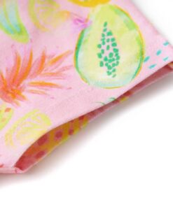 Dit kinderjurkje heeft een ronde halslijn, kapmouwen en een elastische tailleband met trekkoord en het sluit met een knoopje in de nek. Op deze kinderjurk zijn verschillende vruchten afgebeeld. De korte kinderjurk is gemaakt van zacht materiaal met 92% katoen en 8% elastaan, waardoor hij comfortabel en ademend is.