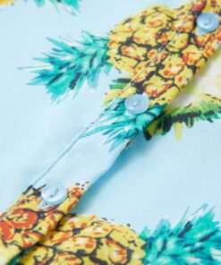 Deze kinderjurk heeft korte mouwen en een omgeslagen kraag en hij sluit met een rij knopen. Deze kinderjurk is met ananassen bedrukt. Het korte kinderjurkje is gemaakt van zacht materiaal met 50% polyester, 40% viscose en 10% katoen, waardoor het comfortabel en ademend is.