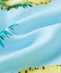 Deze kinderjurk heeft korte mouwen en een omgeslagen kraag en hij sluit met een rij knopen. Deze kinderjurk is met ananassen bedrukt. Het korte kinderjurkje is gemaakt van zacht materiaal met 50% polyester, 40% viscose en 10% katoen, waardoor het comfortabel en ademend is.