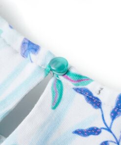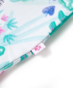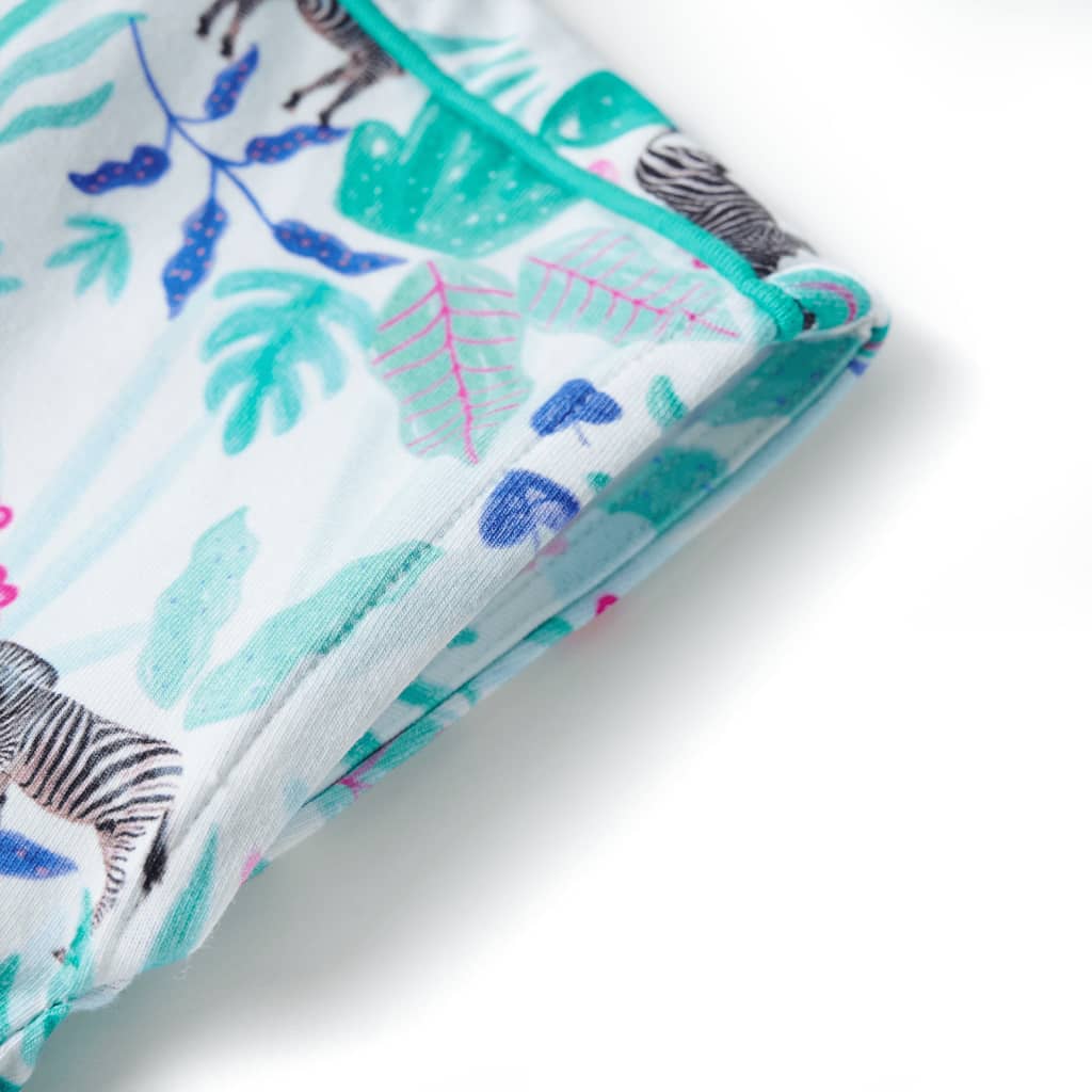 Dit kinderjurkje heeft een ronde halslijn, kapmouwen en een elastische tailleband met trekkoord en het sluit met een knoopje in de nek. Op deze kinderjurk zijn zebra’s, bloemen en bladeren afgebeeld. Het korte kinderjurkje is gemaakt van zacht materiaal met 94% katoen en 6% elastaan voor comfort en ademend vermogen.