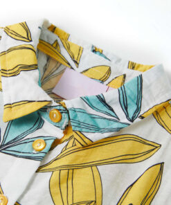 Deze kinderjurk heeft korte mouwen en een omgeslagen kraag en hij sluit met een rij knopen. Deze kinderjurk heeft een bloemenpatroon. Het korte kinderjurkje is gemaakt van zacht materiaal met 80% rayon en 20% nylon, waardoor het comfortabel en ademend is.