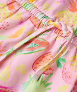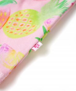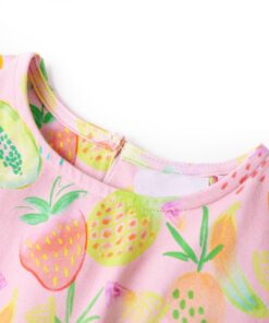 Dit kinderjurkje heeft een ronde halslijn, kapmouwen en een elastische tailleband met trekkoord en het sluit met een knoopje in de nek. Op deze kinderjurk zijn verschillende vruchten afgebeeld. De korte kinderjurk is gemaakt van zacht materiaal met 92% katoen en 8% elastaan, waardoor hij comfortabel en ademend is.