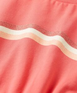 Deze kinderjurk heeft een ronde halslijn, kapmouwen en een elastische tailleband met een verstelbaar trekkoord. Op de kinderjurk staan 3 gekleurde, gebogen strepen afgebeeld. Het korte kinderjurkje is gemaakt van zacht materiaal met 95% katoen en 5% elastaan, waardoor het comfortabel en ademend is.