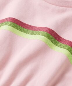 Deze kinderjurk heeft een ronde halslijn, kapmouwen en een elastische tailleband met een verstelbaar trekkoord. Op de kinderjurk staan 3 gekleurde, gebogen strepen afgebeeld. Het korte kinderjurkje is gemaakt van zacht materiaal met 95% katoen en 5% elastaan, waardoor het comfortabel en ademend is.