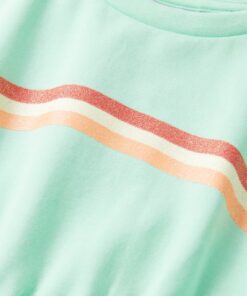 Deze kinderjurk heeft een ronde halslijn, kapmouwen en een elastische tailleband met een verstelbaar trekkoord. Op de kinderjurk staan 3 gekleurde, gebogen strepen afgebeeld. Het korte kinderjurkje is gemaakt van zacht materiaal met 95% katoen en 5% elastaan, waardoor het comfortabel en ademend is.
