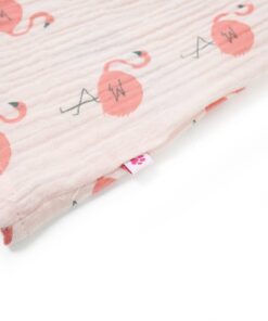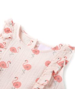 Dit kinderjurkje heeft een ronde halslijn en sluit middels knoopjes aan de achterkant. Dit zachtblauwe kinderjurkje heeft mooie ruches die vanaf de voorkant langs de mouwinzet lopen. De jurk heeft een patroon van flamingo’s. Het korte kinderjurkje is gemaakt van zacht materiaal met katoen, waardoor het comfortabel en ademend is.