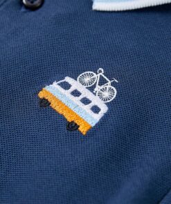 Dit kinderpoloshirt heeft korte mouwen, een knoopsluiting en een geribbelde kraag. Het kinderpoloshirt heeft een bus en fiets op de borst. Het poloshirt is gemaakt van 100% katoen, waardoor het zacht en comfortabel aanvoelt.