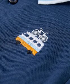 Dit kinderpoloshirt heeft korte mouwen, een knoopsluiting en een geribbelde kraag. Het kinderpoloshirt heeft een bus en fiets op de borst. Het poloshirt is gemaakt van 100% katoen, waardoor het zacht en comfortabel aanvoelt.