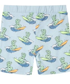 Deze kinderpyjama met korte mouwen heeft een ronde halslijn, een elastische tailleband en een normale pasvorm. Deze kinderpyjama heeft een patroon van surfende dinosaurussen. De kinderpyjama is gemaakt van zacht materiaal met 100% katoen, waardoor hij comfortabel en ademend is.