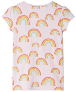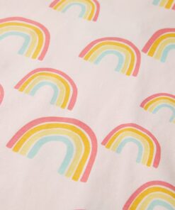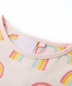 Deze kinderpyjama met korte mouwen heeft een ronde halslijn, een elastische tailleband en een normale pasvorm. Deze kinderpyjama heeft een patroon van regenbogen. De kinderpyjama is gemaakt van zacht materiaal met 95% katoen en 5% elastaan, waardoor hij comfortabel en ademend is.