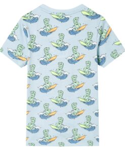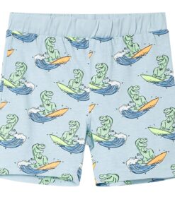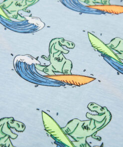 Deze kinderpyjama met korte mouwen heeft een ronde halslijn, een elastische tailleband en een normale pasvorm. Deze kinderpyjama heeft een patroon van surfende dinosaurussen. De kinderpyjama is gemaakt van zacht materiaal met 100% katoen, waardoor hij comfortabel en ademend is.