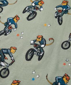 Deze kinderpyjama met korte mouwen heeft een ronde halslijn, een elastische tailleband en een normale pasvorm. Deze kinderpyjama heeft een patroon van dieren die op een fiets rijden. De kinderpyjama is gemaakt van zacht materiaal met 100% katoen, waardoor hij comfortabel en ademend is.