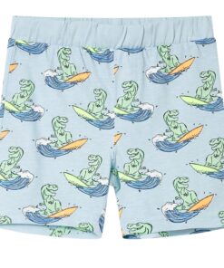 Deze kinderpyjama met korte mouwen heeft een ronde halslijn, een elastische tailleband en een normale pasvorm. Deze kinderpyjama heeft een patroon van surfende dinosaurussen. De kinderpyjama is gemaakt van zacht materiaal met 100% katoen, waardoor hij comfortabel en ademend is.