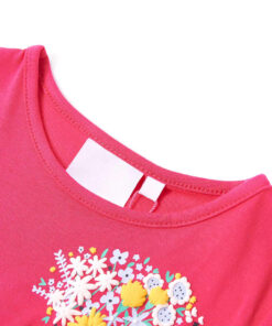 Dit kindershirt heeft korte mouwen, een ronde halslijn en een recht model. Op dit felroze T-shirt staat een prachtige bos bloemen afgebeeld en het heeft een opgestikte zak op de linkerborst. Het kindershirt met korte mouwen is gemaakt van 95% katoen en 5% elastaan, waardoor hij comfortabel en ademend is.
