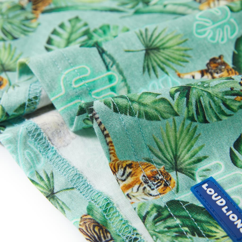 Dit kindershirt heeft korte mouwen, een ronde halslijn en een recht model. Op dit kindershirt heeft een patroon van tijgers en planten. Het kindershirt met korte mouwen is gemaakt van 100% gekamd katoen dat met een silicone- en enzymwassing is behandeld, zodat het zacht en comfortabel aanvoelt.