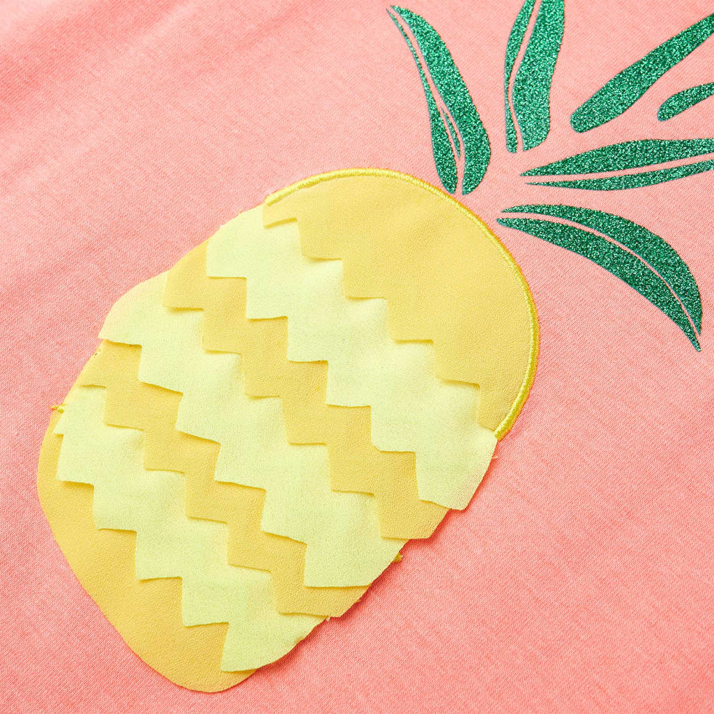 Het mouwloze kindershirt heeft een ronde halslijn en een recht model. Op dit kindershirt staat op de voorkant een ananas afgebeeld. Het kindershirt is gemaakt van katoen, polyester en elastaan, waardoor het zacht en comfortabel aanvoelt.