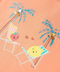 Dit kindershirt heeft korte mouwen, een ronde halslijn en een recht model. Op dit perzikkleurige T-shirt staan 2 schattige stripfiguren afgebeeld die op een paar strandstoelen onder de palmbomen liggen te loungen. Het kindershirt met korte mouwen is gemaakt van zacht materiaal met 95% katoen en 5% elastaan, waardoor het extra comfortabel en ademend is.