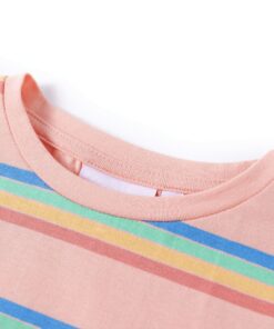 Dit kindershirt heeft korte mouwen met elastische manchetten, een ronde halslijn en een recht model. Op dit perzikkleurige kindershirt staan regenboogstrepen afgebeeld. Het kindershirt met korte mouwen is gemaakt van zacht materiaal met 95% katoen en 5% elastaan, waardoor hij extra comfortabel en ademend is.