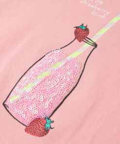 Dit kindershirt heeft korte mouwen, een ronde halslijn en een recht model. Op de voorkant van dit kindershirt staat een fles met een aardbeiendrankje afgebeeld. Het kindershirt is gemaakt van katoen en elastaan, waardoor het zacht en comfortabel aanvoelt.