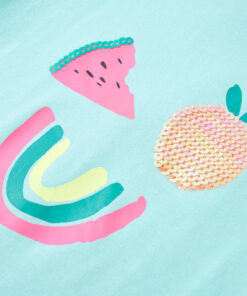 Dit kindershirt heeft korte opgerolde mouwen, een ronde halslijn en een recht model. Op dit kindershirt staan een kleurrijke watermeloen en een appel van pailletten afgebeeld, waardoor het shirt nog mooier en leuker wordt. Het kindershirt met korte mouwen is gemaakt van zacht materiaal met 95% katoen en 5% elastaan, waardoor het extra comfortabel en ademend is.