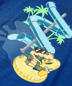 Dit kindershirt heeft korte mouwen, een ronde halslijn en een recht model. Op dit kindershirt staat een leuke cartoon afgebeeld met een waterglijbaan, een krokodil met een zwemband en palmbomen. Het T-shirt is gemaakt van 100% katoen, waardoor het zacht en comfortabel aanvoelt.