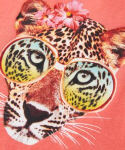 Dit kindershirt heeft korte mouwen, een ronde halslijn en een recht model. Dit kindershirt heeft een luipaardkop met een modieuze bril en bloemen op de borst. Het kindershirt met korte mouwen is gemaakt van 95% katoen en 5% elastaan, waardoor het comfortabel en ademend is.