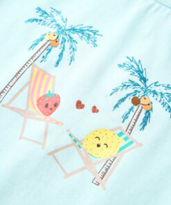 Dit kindershirt heeft korte mouwen, een ronde halslijn en een recht model. Op dit lichtzeeblauwe T-shirt staan 2 schattige stripfiguren afgebeeld die op een paar strandstoelen onder de palmbomen liggen te loungen. Het kindershirt met korte mouwen is gemaakt van zacht materiaal met 95% katoen en 5% elastaan, waardoor het extra comfortabel en ademend is.