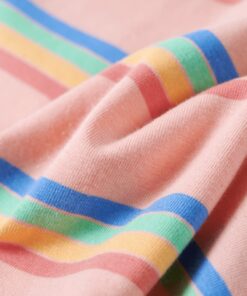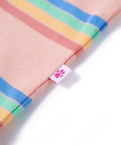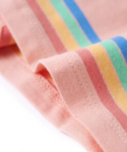 Dit kindershirt heeft korte mouwen met elastische manchetten, een ronde halslijn en een recht model. Op dit perzikkleurige kindershirt staan regenboogstrepen afgebeeld. Het kindershirt met korte mouwen is gemaakt van zacht materiaal met 95% katoen en 5% elastaan, waardoor hij extra comfortabel en ademend is.