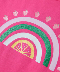 Dit kindershirt heeft korte mouwen met ingenaaide omslagen, een ronde halslijn en een recht model. Op dit kindershirt staat een glimmende regenboog afgebeeld met langs de buitenste rand allemaal aardbeien. Het kindershirt met korte mouwen is gemaakt van 95% katoen en 5% elastaan, waardoor hij comfortabel en ademend is.