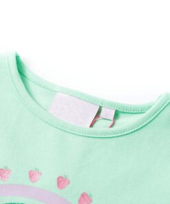 Dit kindershirt heeft korte mouwen met ingenaaide omslagen, een ronde halslijn en een recht model. Op dit kindershirt staat een glimmende regenboog afgebeeld met langs de buitenste rand allemaal aardbeien. Het kindershirt met korte mouwen is gemaakt van 95% katoen en 5% elastaan, waardoor hij comfortabel en ademend is.