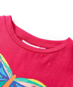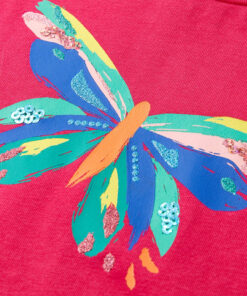 Dit kindershirt heeft korte mouwen, een ronde halslijn en een recht model. Dit kindershirt heeft een kleurrijke vlinder van pailletten op de voorkant en op de mouwen zitten decoratieve strikjes. Het kindershirt met korte mouwen is gemaakt van 95% katoen en 5% elastaan, waardoor hij comfortabel en ademend is.