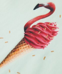 Dit kindershirt heeft korte mouwen met ruches, een ronde halslijn en een recht model. Op dit kindershirt staat een flamingo-ijsje afgebeeld, waardoor hij een blikvanger met een interessante uitstraling is. Het kindershirt met korte mouwen is gemaakt van 95% katoen en 5% elastaan, waardoor hij comfortabel en ademend is.