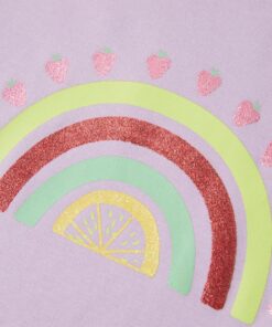 Dit kindershirt heeft korte mouwen met ingenaaide omslagen, een ronde halslijn en een recht model. Op dit kindershirt staat een glimmende regenboog afgebeeld met langs de buitenste rand allemaal aardbeien. Het kindershirt met korte mouwen is gemaakt van 95% katoen en 5% elastaan, waardoor hij comfortabel en ademend is.