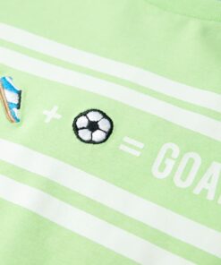 Dit kindershirt heeft korte mouwen, een ronde halslijn en een recht model. Op dit kindershirt staan horizontale strepen op de borst. De print bestaat uit een voetbalschoen, een voetbal en het woord “GOAL”. Het kindershirt is gemaakt van katoen, polyester en elastaan, waardoor het zacht en comfortabel aanvoelt.