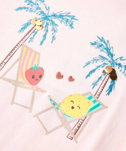 Dit kindershirt heeft korte mouwen, een ronde halslijn en een recht model. Op dit zachtroze T-shirt staan 2 schattige stripfiguren afgebeeld die op een paar strandstoelen onder de palmbomen liggen te loungen. Het kindershirt met korte mouwen is gemaakt van zacht materiaal met 95% katoen en 5% elastaan, waardoor hij extra comfortabel en ademend is.