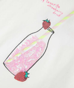 Dit kindershirt heeft korte mouwen, een ronde halslijn en een recht model. Op de voorkant van dit kindershirt staat een fles met een aardbeiendrankje afgebeeld. Het kindershirt is gemaakt van katoen en elastaan, waardoor het zacht en comfortabel aanvoelt.