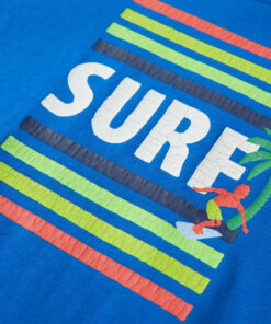 Dit kindershirt heeft korte mouwen, een ronde halslijn en een recht model. Op dit kindershirt staan horizontale strepen op de borst. Op dit kindershirt staat het woord SURF, een surfer en een palmboom afgebeeld. Het T-shirt is gemaakt van 100% katoen, waardoor het zacht en comfortabel aanvoelt.