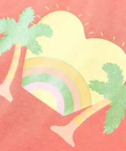 Dit kindershirt heeft korte mouwen, een ronde halslijn en een recht model. Op dit kindershirt staan een regenboog en palmbomen afgebeeld. Het kindershirt met korte mouwen is gemaakt van 95% katoen en 5% elastaan, waardoor hij comfortabel en ademend is.