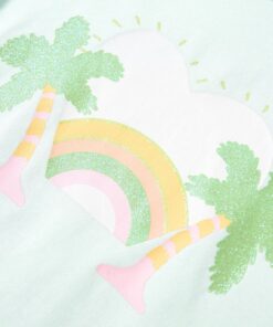 Dit kindershirt heeft korte mouwen, een ronde halslijn en een recht model. Op dit kindershirt staan een regenboog en palmbomen afgebeeld. Het kindershirt met korte mouwen is gemaakt van 95% katoen en 5% elastaan, waardoor het comfortabel en ademend is.