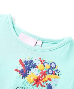 Dit kindershirt heeft korte mouwen, een ronde halslijn en een recht model. Op dit lichtmintkleurige T-shirt staat een prachtige bos bloemen afgebeeld en het heeft een opgestikte zak op de linkerborst. Het kindershirt met korte mouwen is gemaakt van 95% katoen en 5% elastaan, waardoor hij comfortabel en ademend is.