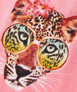 Dit kindershirt heeft korte mouwen, een ronde halslijn en een recht model. Dit kindershirt heeft een luipaardkop met een modieuze bril en bloemen op de borst. Het kindershirt met korte mouwen is gemaakt van 95% katoen en 5% elastaan, waardoor het comfortabel en ademend is.