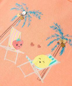 Dit kindershirt heeft korte mouwen, een ronde halslijn en een recht model. Op dit perzikkleurige T-shirt staan 2 schattige stripfiguren afgebeeld die op een paar strandstoelen onder de palmbomen liggen te loungen. Het kindershirt met korte mouwen is gemaakt van zacht materiaal met 95% katoen en 5% elastaan, waardoor het extra comfortabel en ademend is.